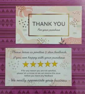 No mention of feed back or returns. We hope it meets your exsoectations as we strive to describe our items completely. Or do you mean a note on the email that is sent when postage is printed? Make sure to enclose a thank you note inside your ebay package.