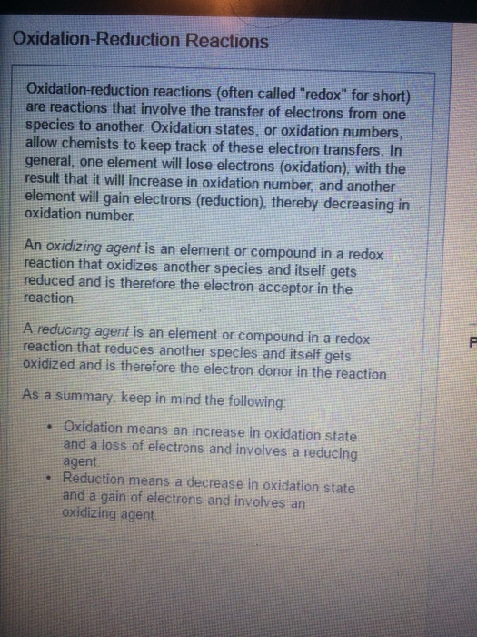 In chemistry, an oxidising agent (oxidant, oxidizer) is a subs… a reducing agent (also called a. In reality, oxidation and reduction always occur together; The redox reactions are very common and. Introducing oxidation states, oxidation, and reduction.