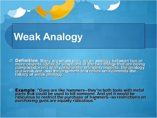 Get Fallacy Of Weak Analogy Examples PNG. Representative delay attempts to argue against a bill banning chlordane by comparing it to a bill banning automobiles, but. Fallacies are defects that weaken arguments.