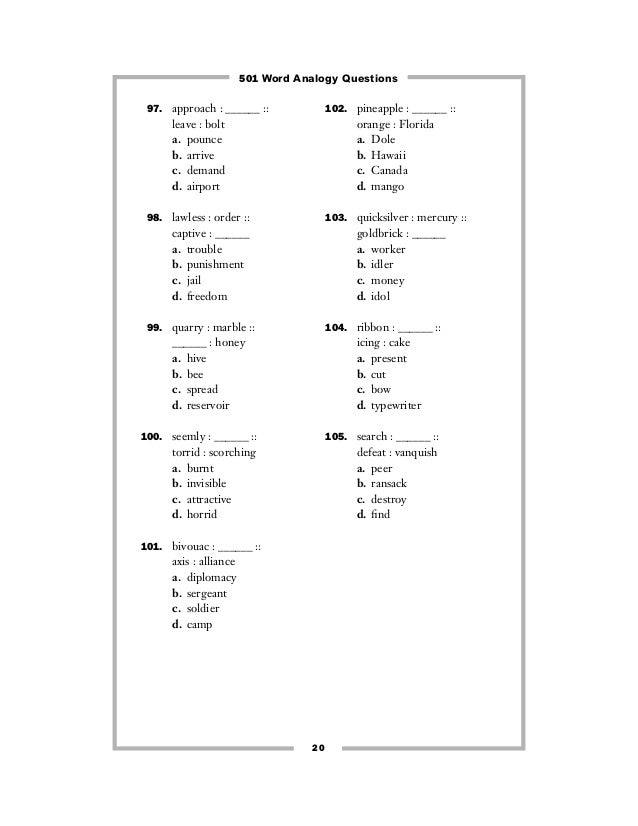 38+ Word Analogy Test With Answers Pdf Images. Summarize each analogy relationship with a sentence. The first noun here is an animal, the second a means of controlling it, as a “horse” is controlled by a “bridle.”.